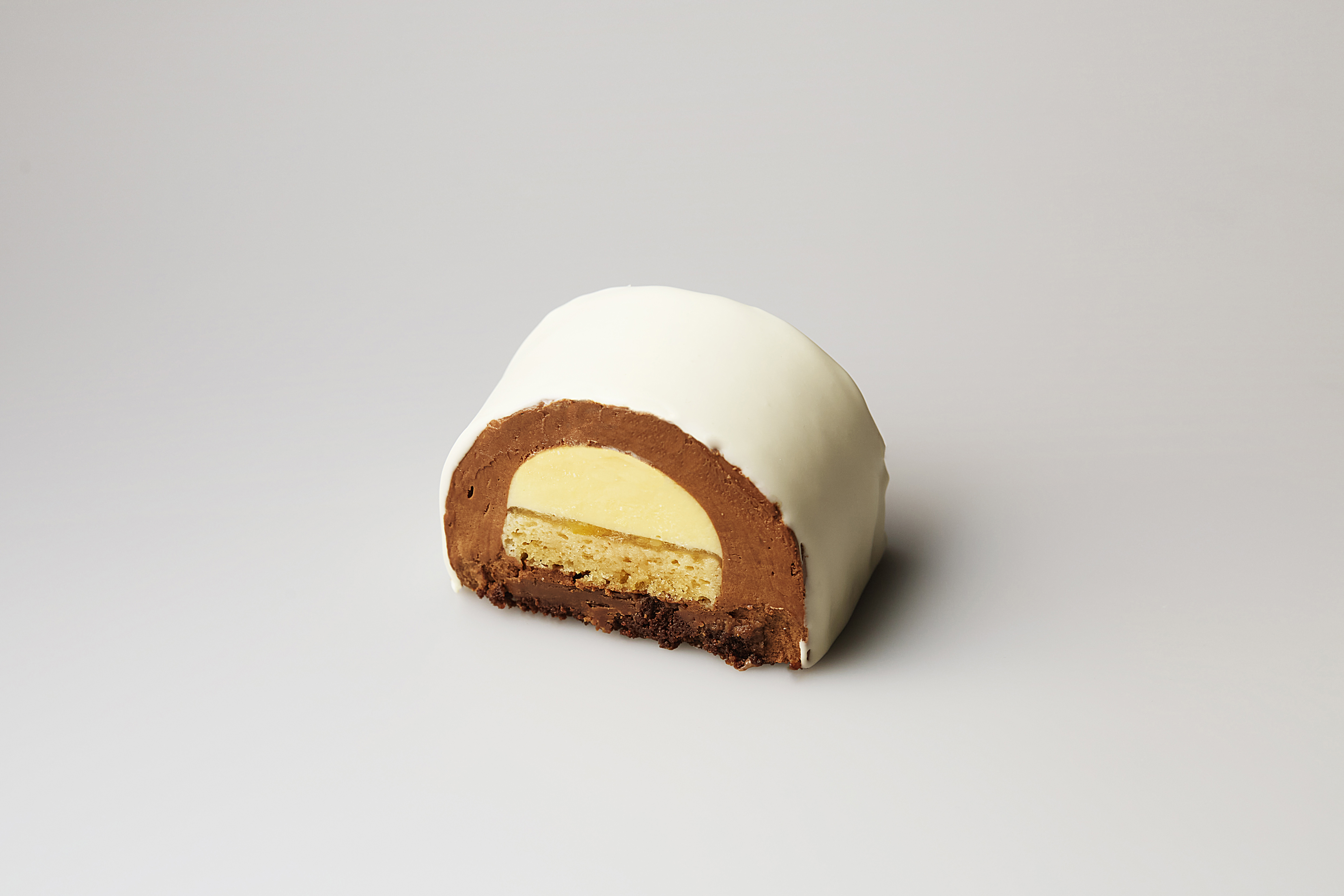Beneath a shimmering white glaze lies a rich chocolate mousse filled with yuzu cream and ganache. Layers of gianduja, brûlée chocolate, and delicate crumble offer depth and texture in every bite.