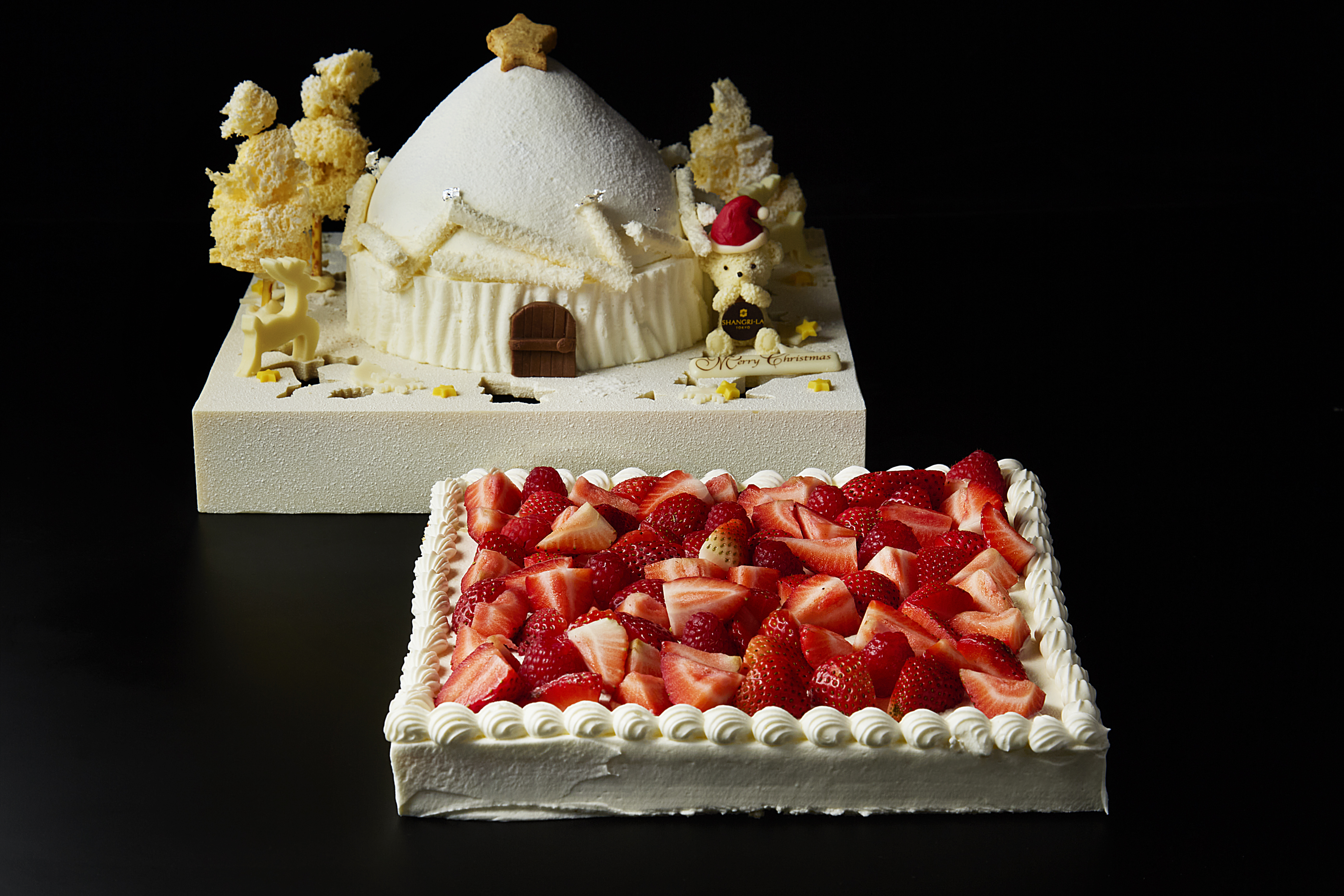 シャングリ・ラ ベアやトナカイが並ぶ、夢のような雪の家を模した壮大なケーキ。ベイクドチーズケーキ、レモンカード、レアチーズを層にした部分に、ストロベリーショートケーキで作られた屋根部分が乗っています。