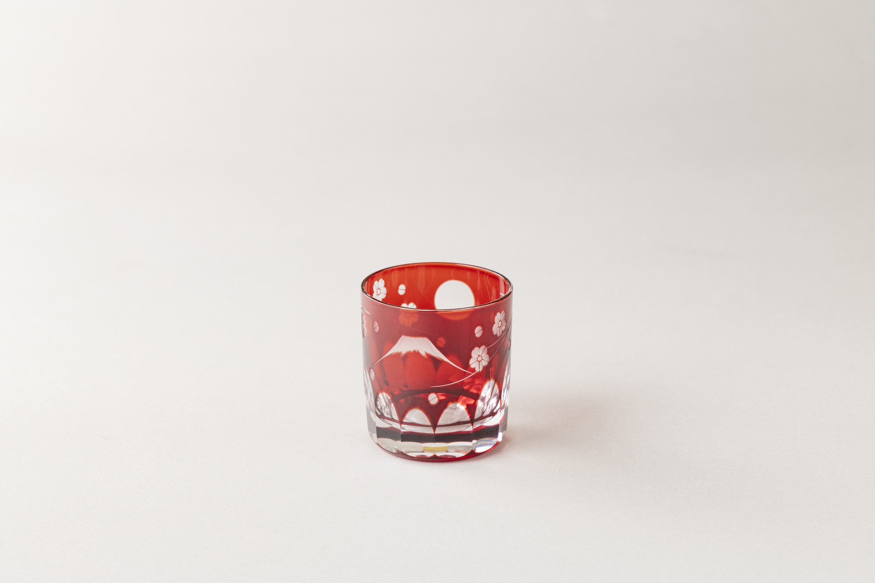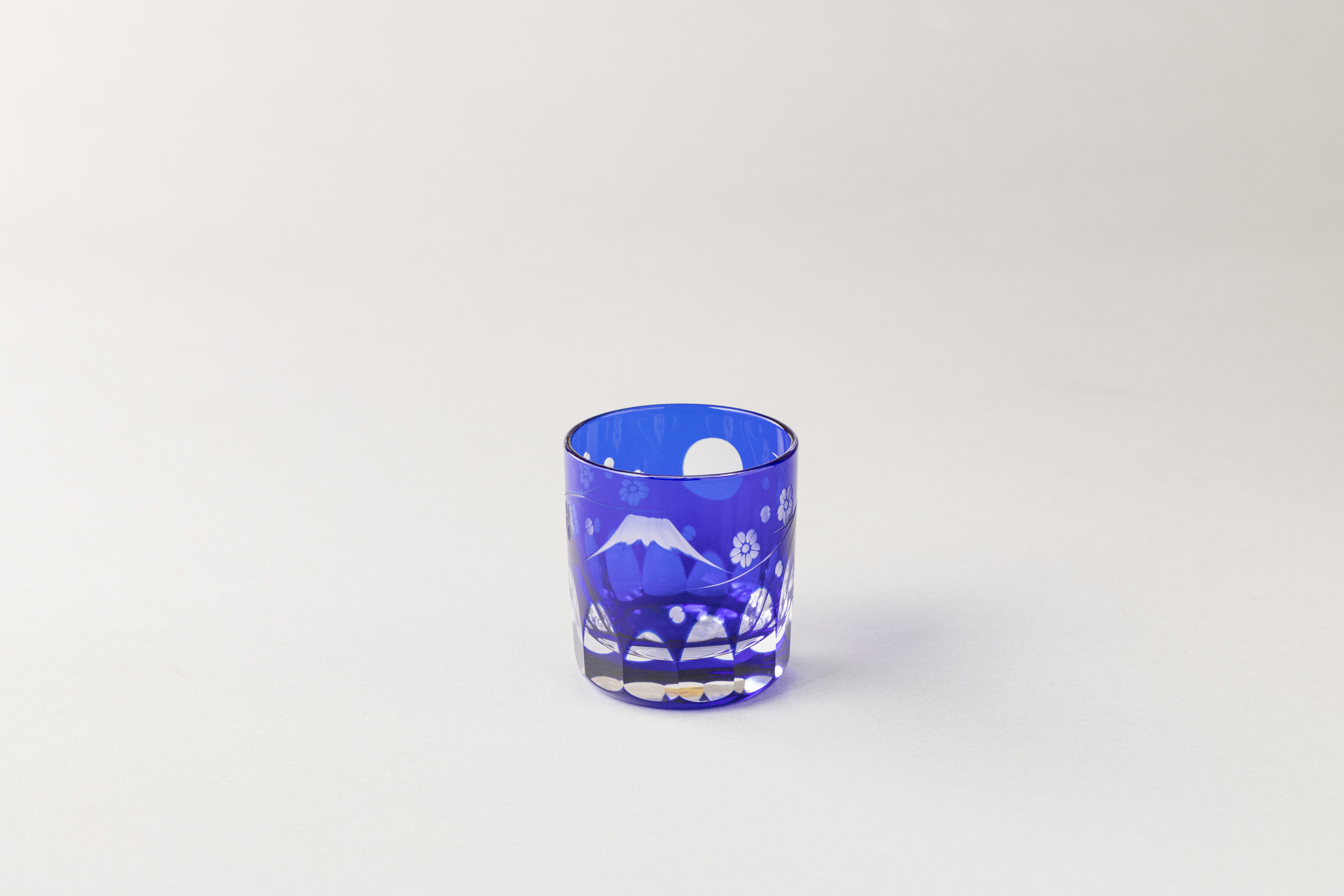 This Edo Kiriko piece features a floral motif inspired by two iconic symbols of Japan: cherry blossoms and Mount Fuji. Through the round moon, you can glimpse the silhouette of Mount Fuji, creating a work of elegance and charm.