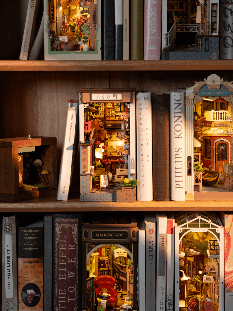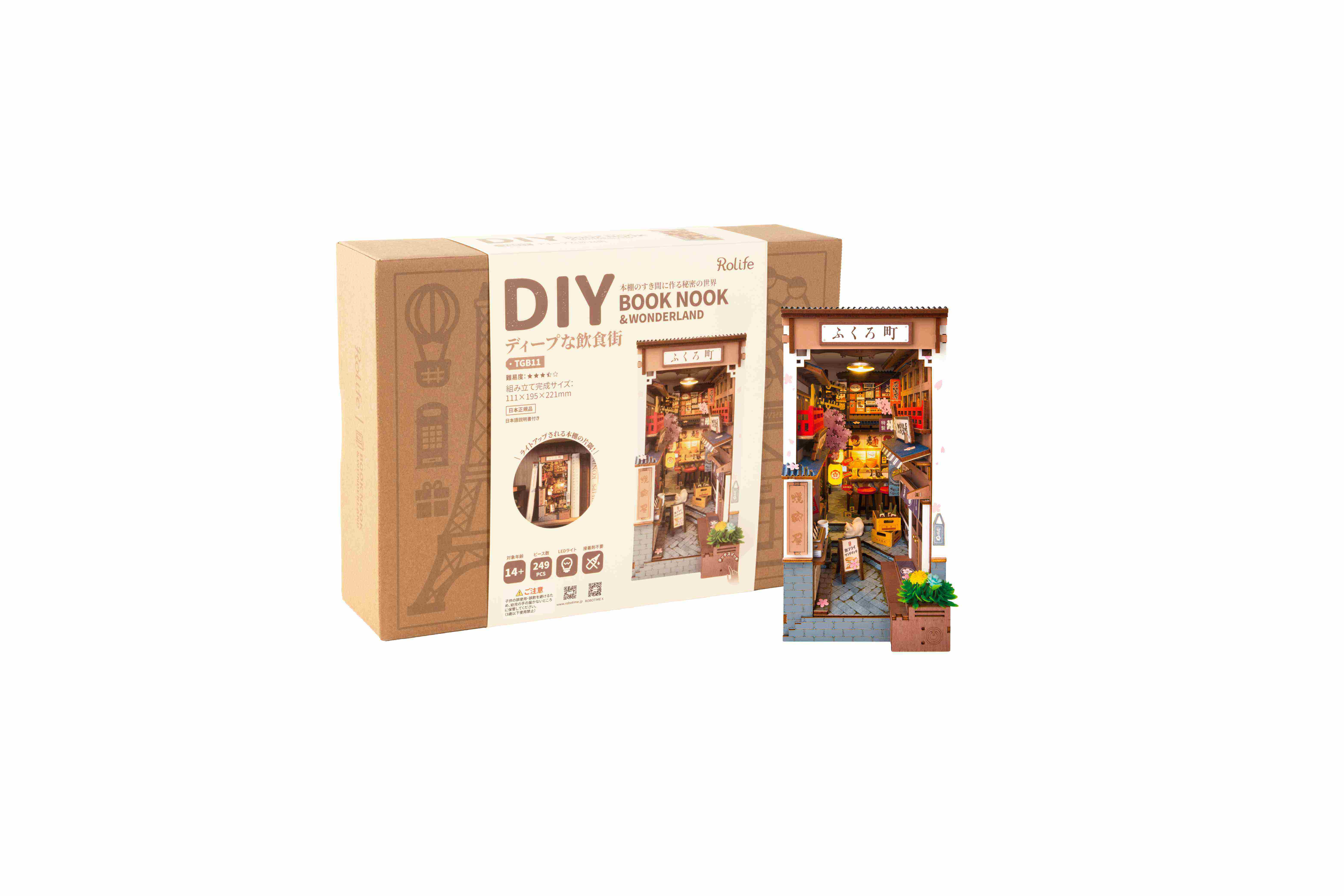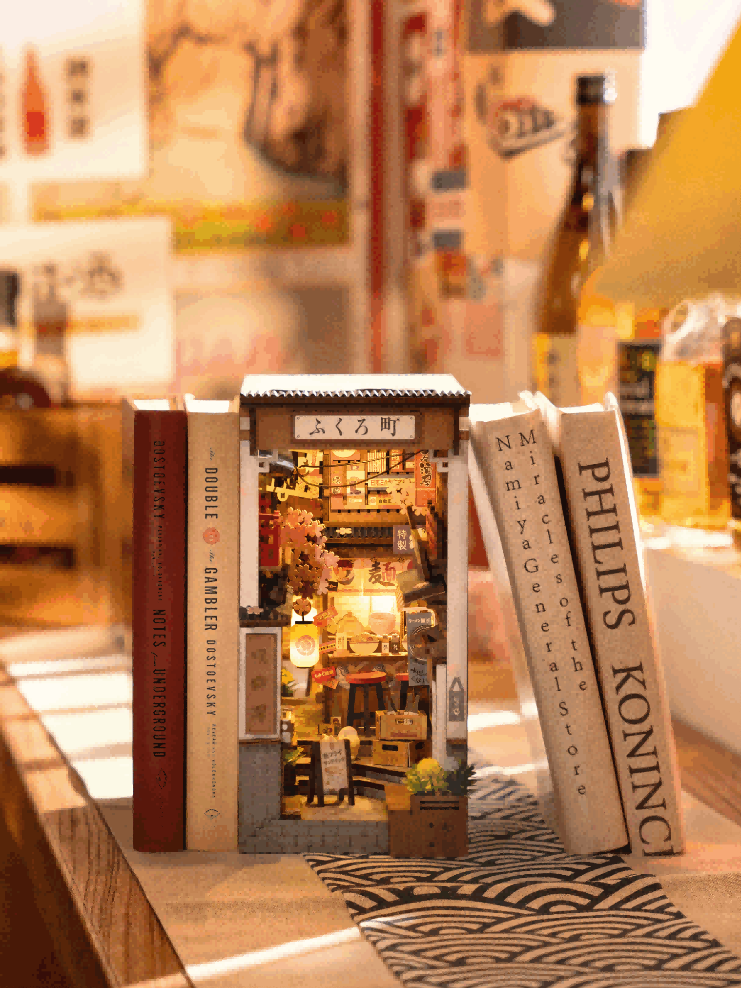 This 'DIY' book nook is inspired by Japan's backstreet dining districts. Warmly lit storefronts and narrow alleys lined with vintage signs are recreated through precision-cut wooden parts and meticulously detailed miniature elements. With each piece assembled, a scene with depth emerges, evoking the feeling of stepping into a quiet alley brimming with local charm. Designed for easy snap-fit assembly requiring no tools. This bookend offers a relaxing, immersive crafting experience. Once complete, it adds the soft glow of a Japanese nightscape to your bookshelf.