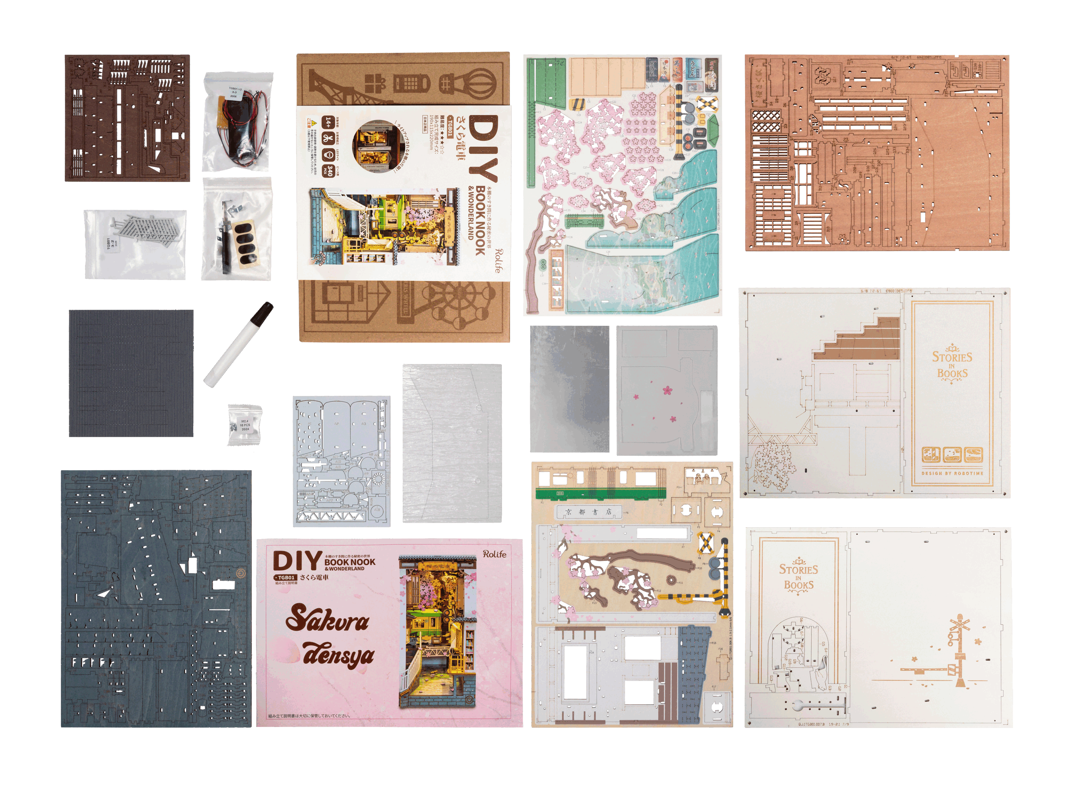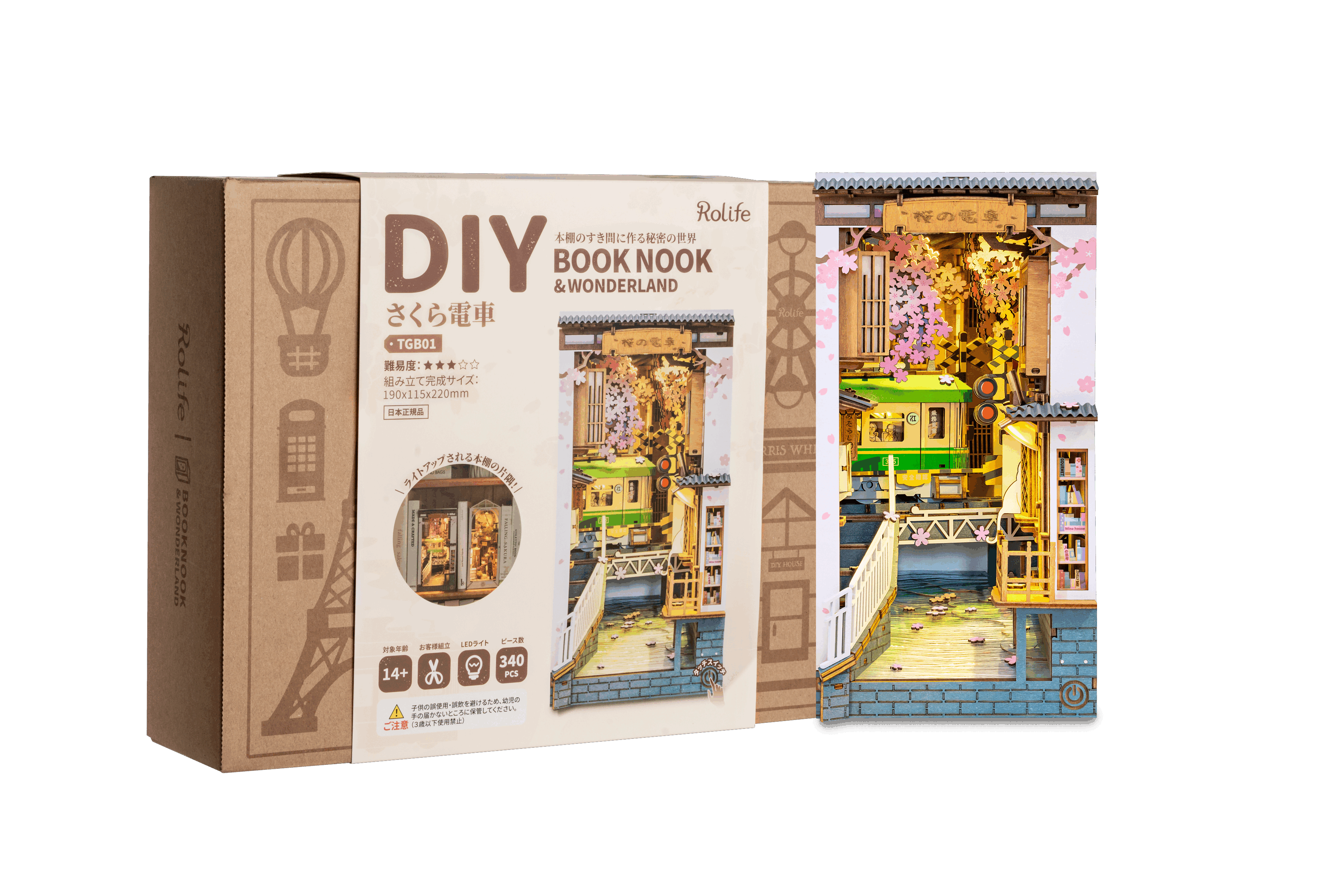 Enveloped in the soft light of spring, a small streetcar runs quietly. The “Sakura Train” is a wooden bookend that recreates the scene of cherry blossoms in full bloom lining the streets and a nostalgic town corner within a bookshelf. By carefully assembling each intricately cut wooden piece, a three-dimensional landscape with depth gradually emerges. Even the scene of gently falling cherry blossom petals and a small stream flowing softly over the ground is meticulously depicted. The moment it's completed, a world unfolds as if you've stepped into a springtime Japanese town. Once finished, it becomes a “spring scene” softly illuminated within your bookshelf, adding a story to your space.