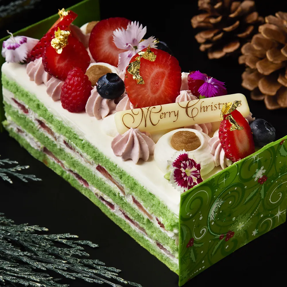 天然由来のビビッドな緑色のスポンジと、ストロベリーやラズベリーがクリスマスカラーのコンビネーションを作り出し、フェスティブムードを盛り上げます。